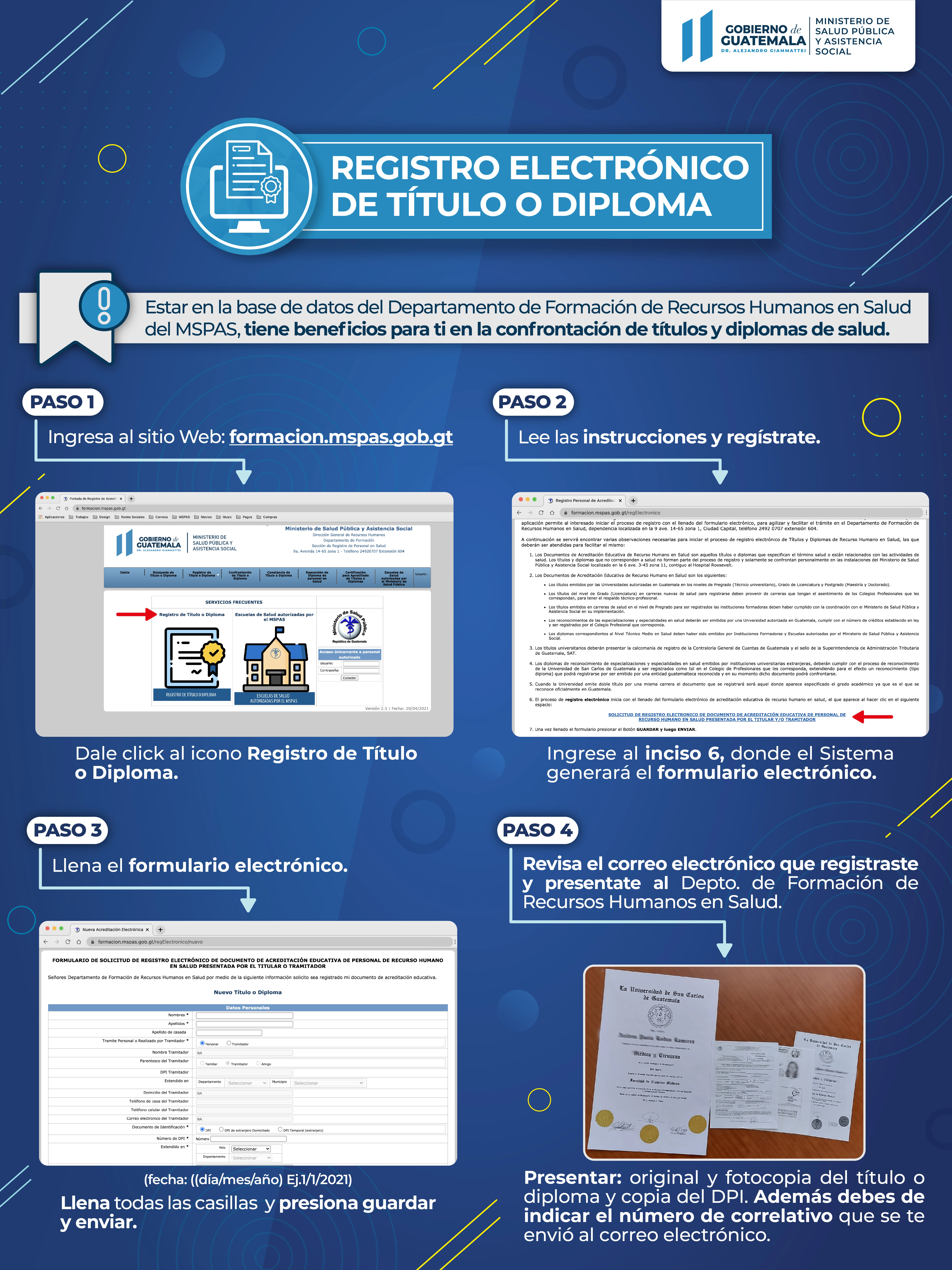 A continuación se muestran los pasos necesarios para registrar su título en el Departamento de Formación del MSPAS. Puede ampliar la imagen para ver los detalles.